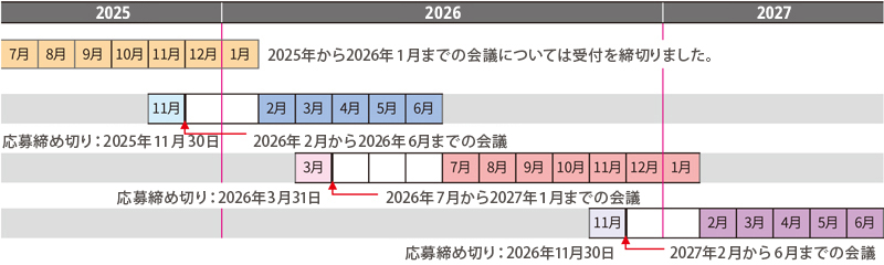 注)上記のように申込期日が設定されていますので、2,3,4,5,6月に会議開催の場合は前年の11月30日までに、7,8,9,10,11,12月, 及び翌年1月に会議開催予定の場合はその年の3月31日までに、それぞれ提出する必要があります。